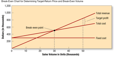 The manufacturer will realize this 20 percent ROI, provided its costs and estimated sales turn out to be accurate. But what if sales don’t reach 50,000 units? The manufacturer can prepare a break-even chart to learn what would happen at other sales levels . Fixed costs are $300,000 regardless of sales volume. Variable costs, not shown in the figure, rise with volume. Total costs equal the sum of fixed and variable costs. The total revenue curve starts at zero and rises with each unit sold.