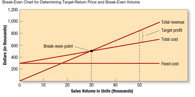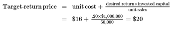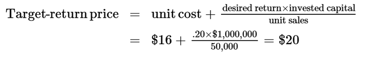 Example: the toaster manufacturer has invested $1 million in the business and wants to set a price to earn a 20 percent ROI, specifically $200,000. The target-return price is given by the following formula: